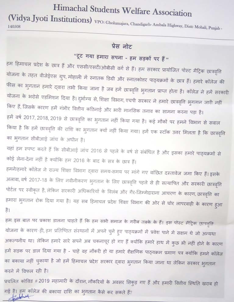 इन योजनाओं के तहत यह बच्चे प्रदेश से बाहर स्थित संस्थानों में भी पढ़ाई कर रहे हैं। पोस्ट मैट्रिक छात्रवृति योजना के तहत स्नातक और स्नातकोत्तर डिग्री करने के लिये इन छात्रों को प्रतिवर्ष करीब 3,80,000 रूपये दिये जाते हैं। स्वभाविक है कि इन वर्गों के छात्र इतना खर्च अपनी जेब से नही कर सकते और सरकार द्वारा छात्रवृति भुगतान पर ही इनकी पढ़ाई निर्भर करती है। पंजाब के मोहाली स्थित विद्या ज्योति संस्थान की हिमाचल स्टूडैण्ट वैल्फेयर ऐसोसियेशन के प्रैस नोट से यह सामने आया है कि इन वर्गों के छात्रों को वर्ष 2017-18 और 2019 की छात्रवृति का भुगतान अभी तक नहीं हुआ है। यह छात्र कई बार सरकार के सामने अपनी समस्या रख चुके हैं। सीबीआई केस के नाम पर इनकी छात्रवृति रोकी गयी है जबकि इनका दाखिला ही 2016 के बाद का है।