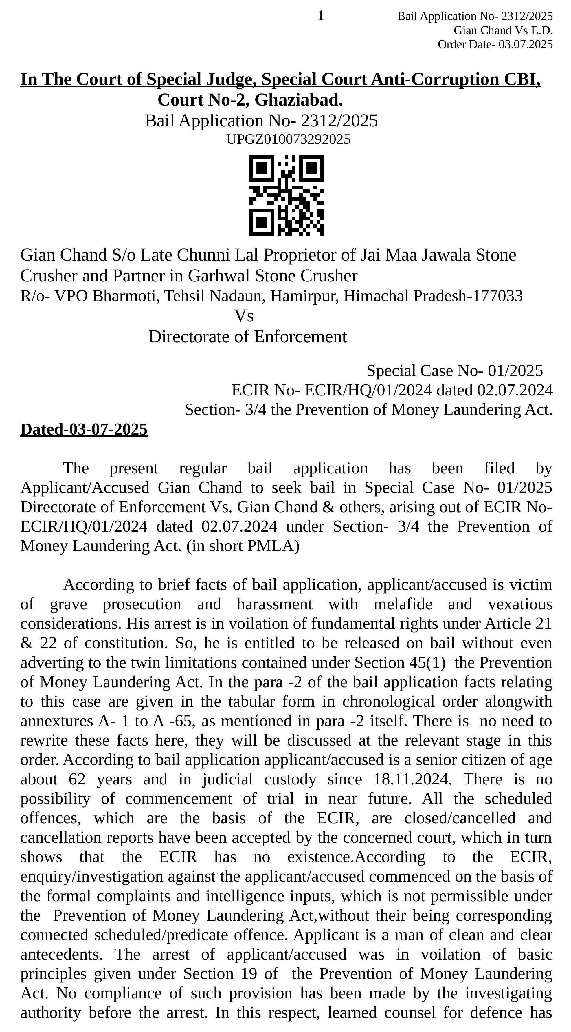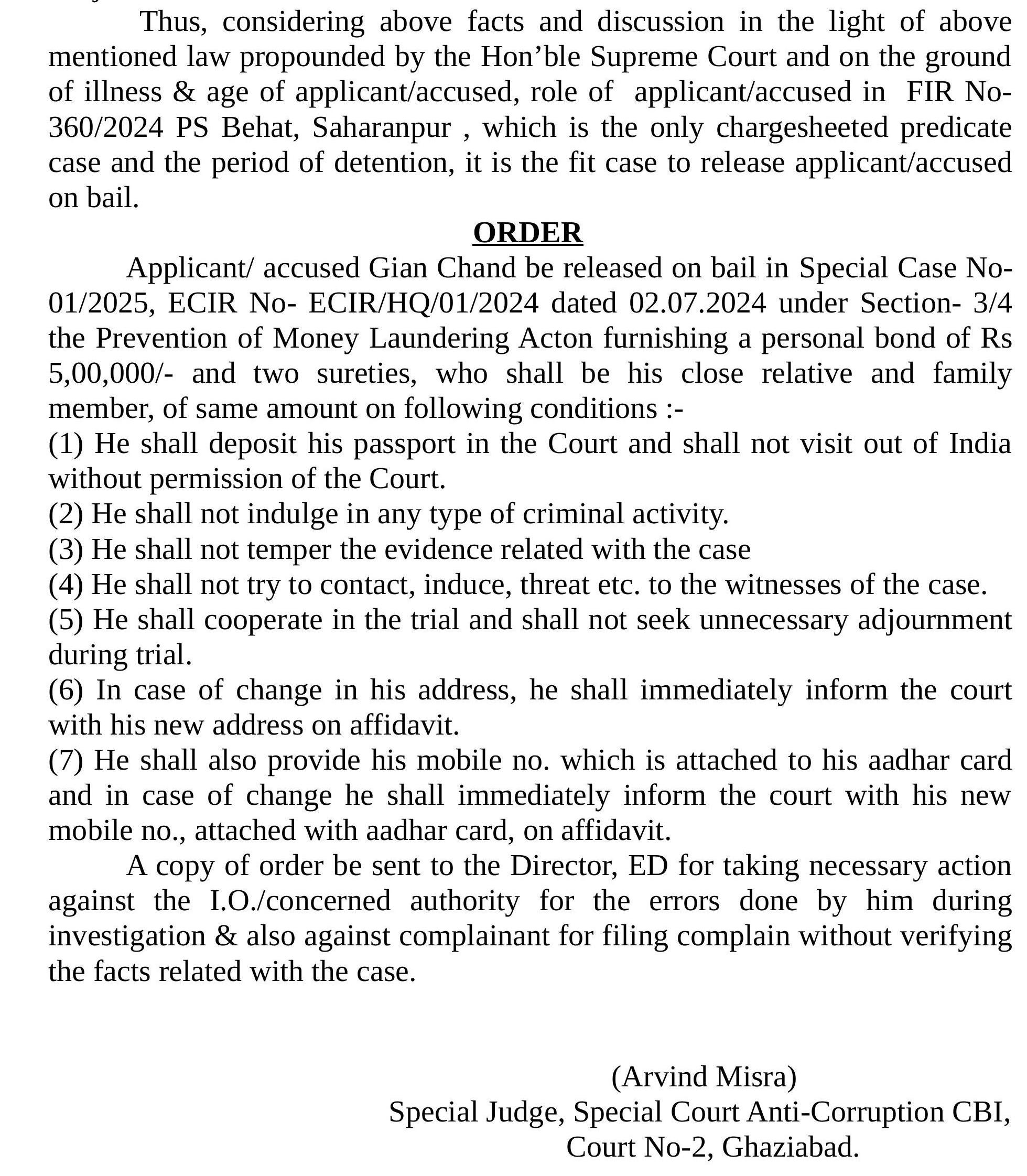 शिमला/शैल। नादौन के खनन कारोबारी और कांग्रेस नेता ज्ञान चन्द को ई.डी. द्वारा दर्ज किये गये मनी लॉन्ड्रिंग में सी.बी.आई. के स्पेशल जज की गाजियाबाद स्थित अदालत से 6-7-2025 को जमानत मिल गयी है। इस जमानत से ई.डी. की कार्य प्रणाली सवालों के घेरे में आ गयी है। क्योंकि विशेष जज ई.डी. की कार्य प्रणाली के जांच अधिकारी और इस मामले के शिकायतकर्ता के खिलाफ आवश्यक कारवाई करने के निर्देश सी.बी.आई. निदेशक को दिये हैं। सम्रणीय है कि ई.डी.ने 2-7-2024 को धन संशोधन की विभिन्न धाराओं में यह मामला दर्ज किया था और 18-11-2024 को इसमें ज्ञान चन्द की गिरफ्तारी हो गयी थी। उस दौरान इस संद्धर्भ में नादौन, हमीरपुर में छापेमारी हुई थी। इस छापेमारी के बाद चार लोगों के खिलाफ मामला बनाये जाने की चर्चाएं सामने आयी थी। लेकिन गिरफ्तारी केवल दो लोगों ज्ञान चन्द और संजय धीमान की हुई थी। लेकिन जमानत केवल ज्ञान चन्द को ही मिली है। शायद संजय की जमानत याचिका अभी तक आयी ही नहीं है।