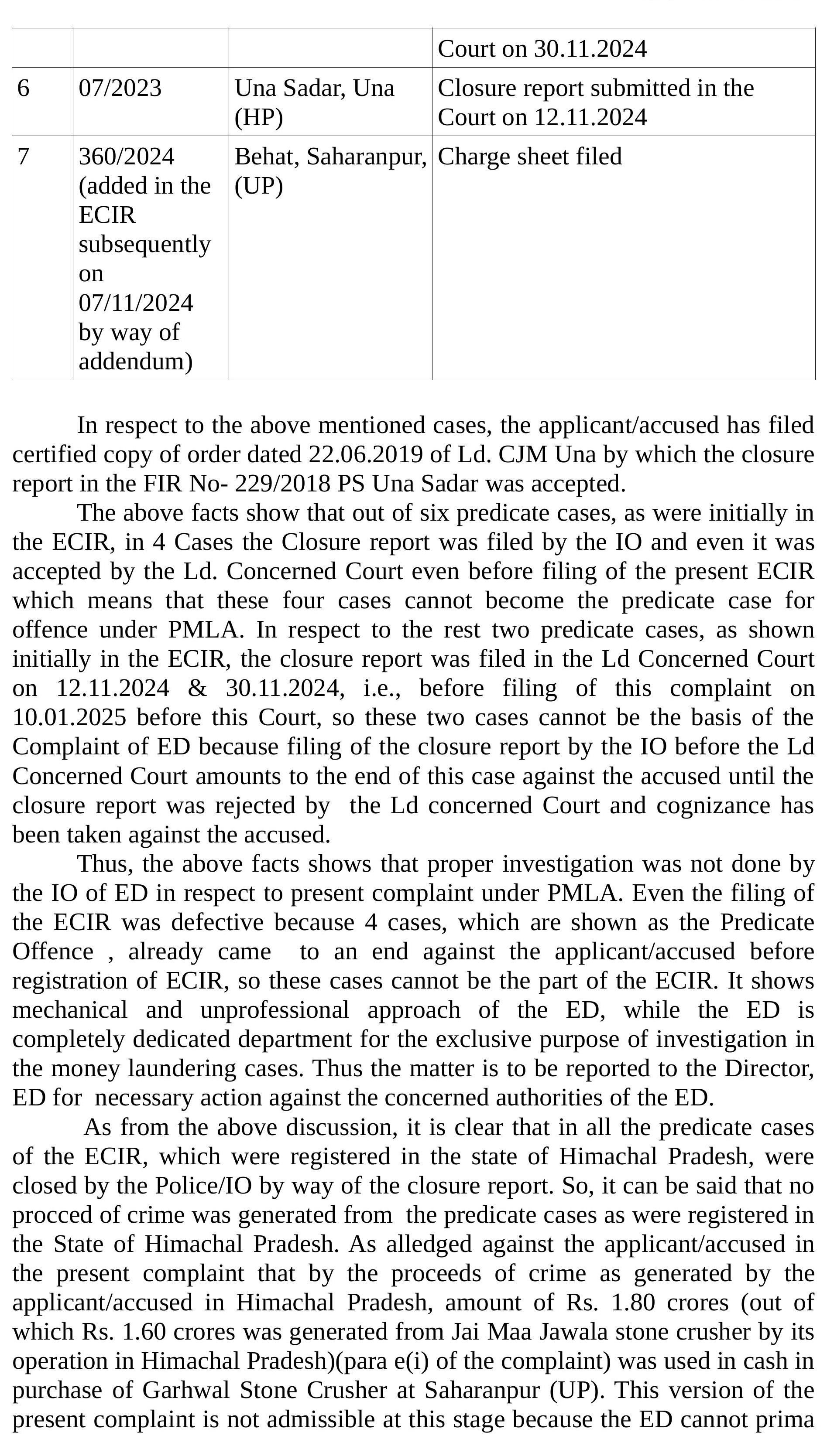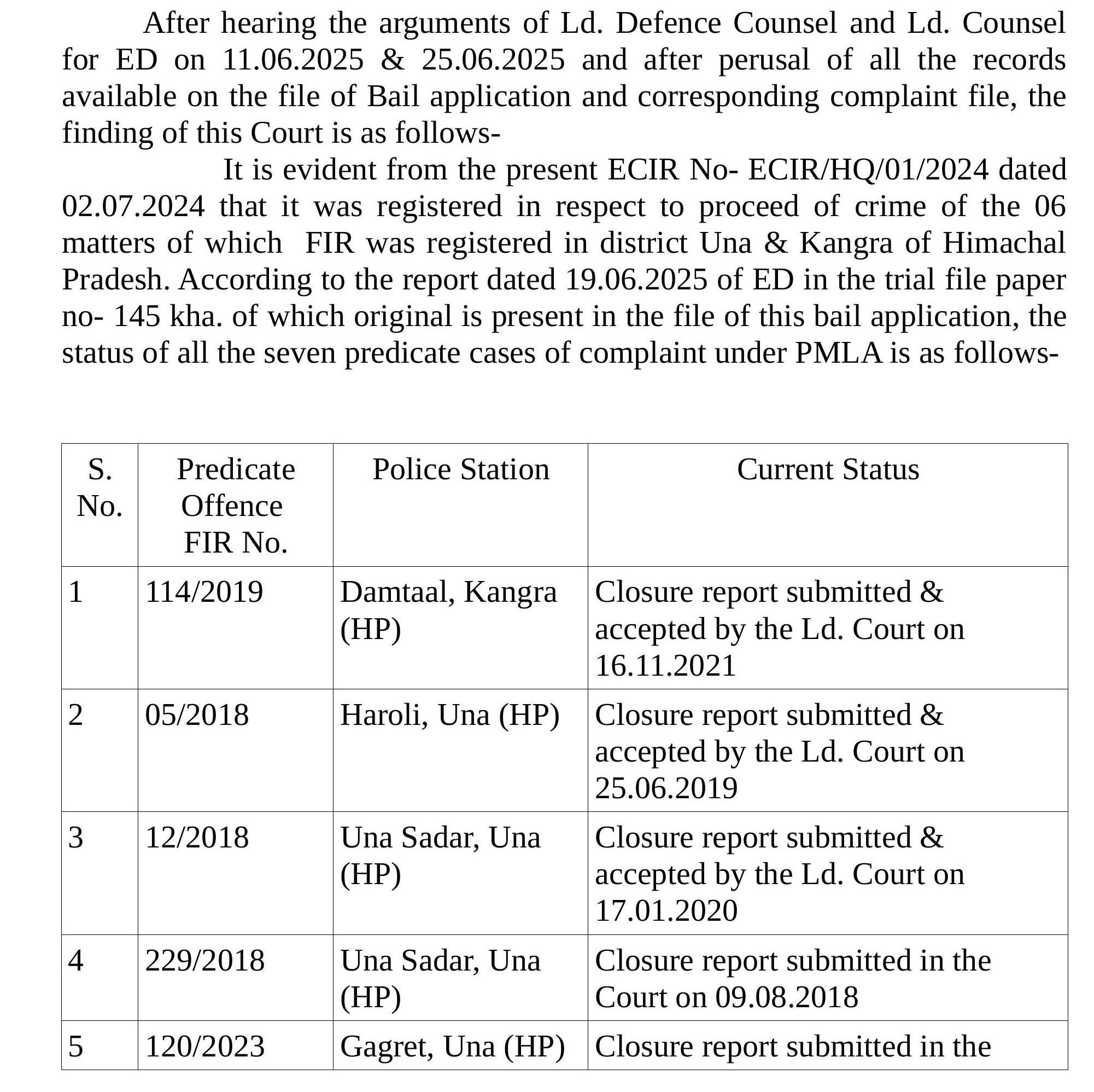 ज्ञान चन्द के खिलाफ यह मामला कुछ शिकायतों और गुप्तचर सूचनाओं के आधार पर दायर किया गया था। इन सूचनाओं और शिकायतों का आधार इन लोगों के खिलाफ कांगड़ा और ऊना में 2018 से लेकर 2024 तक दर्ज किये गये सात मामलों को बनाया गया था। जबकि यह सारे मामले ई.डी. द्वारा 2-7-2024 को दर्ज किये गये मनी लांडरिंग के मामले से पहले ही अदालतों द्वारा निपटा दिये गये थे। सारे मामलों में क्लोजर रिपोर्ट अदालत में दायर और स्वीकार हो चुकी थी। जिसका अर्थ है कि ई.डी. द्वारा मामला दर्ज करने के समय ज्ञान चन्द के खिलाफ कोई भी आपराधिक मामला कहीं पर भी लंबित नहीं था। जबकि ई.डी. द्वारा मामला दर्ज करने के लिये यह अनिवार्य है कि कथित अभियुक्त के खिलाफ कहीं पर कोई मामला चल रहा होना चाहिये। सी.बी.आई. के विशेष जज ने इस वस्तुस्थिति का कड़ा संज्ञान लेते हुये ई.डी. के जांच अधिकारी और शिकायतकर्ता के खिलाफ कारवाई किये जाने की संस्तुति की है।